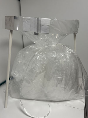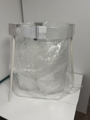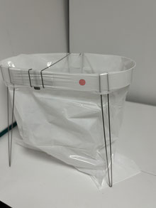 ポリ袋(ゴミ袋)をセットして、スタンドを着けるとゴミ箱に成ります。プラスチックと金属線材で出来ているので、とても軽い。