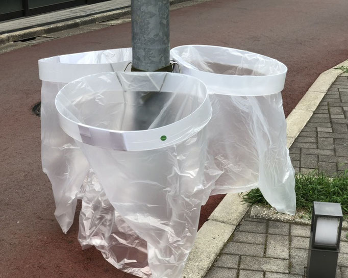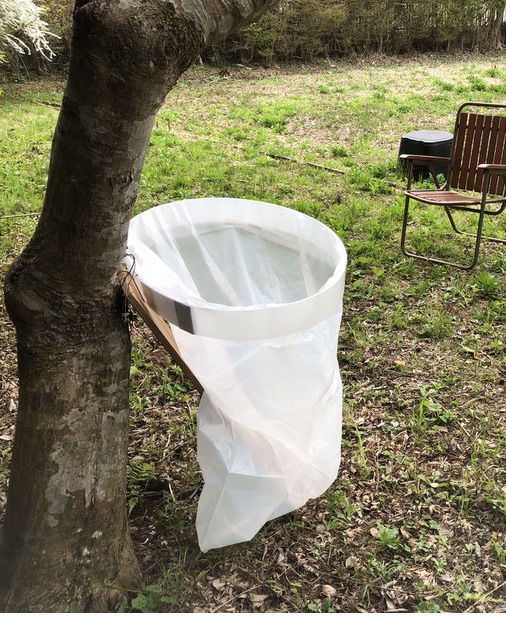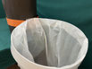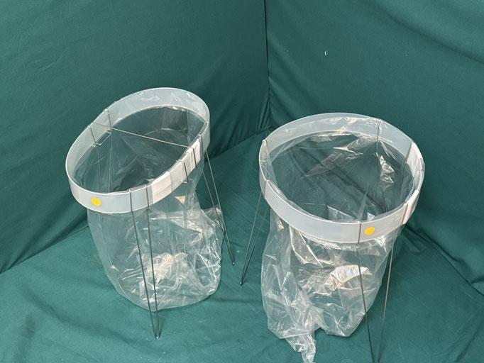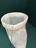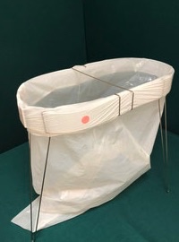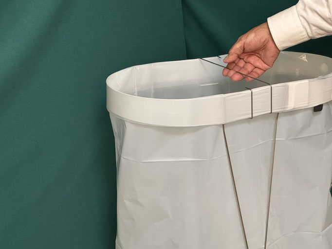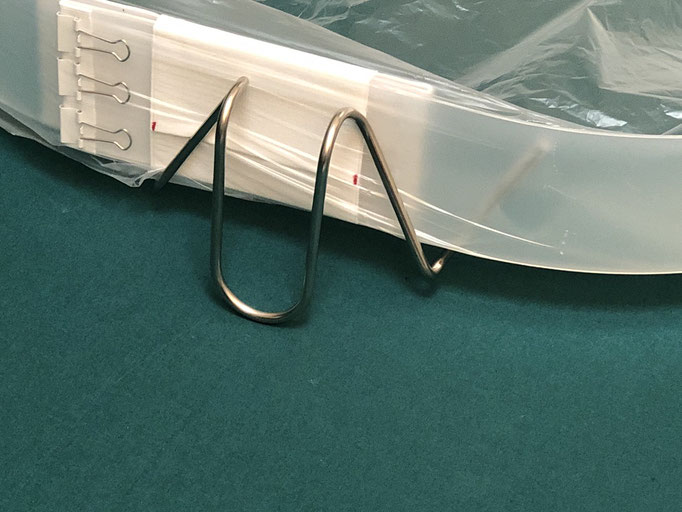 固定治具 固定ベルトでの画像ですが両面テープでもビス留めも可能です、下部の切り込みに袋のセット次に紐をセットして、結束作業を容易にします。
